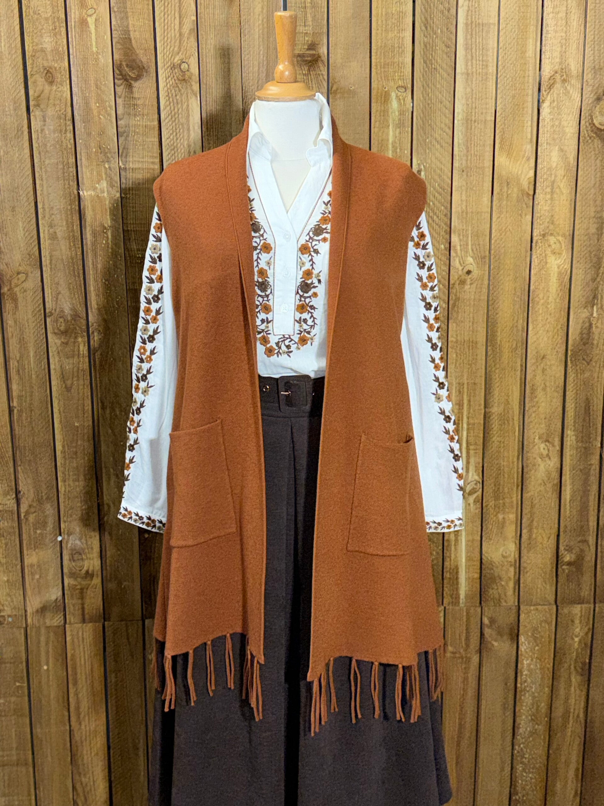 Gilet long sans manches couleur rouille existe en kaki et beige